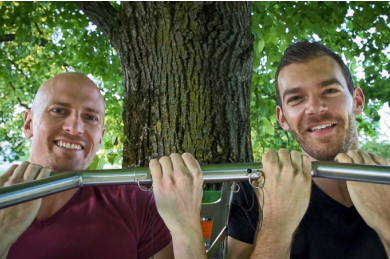 Regularmente realizamos nuestro entrenamiento Freeletics en el Theresienwiese, los terrenos del mundialmente famoso Oktoberfest (Festival de la Cerveza). Estábamos ocupados haciendo barras de dominadas en las porterías de fútbol del campo. No es la barra perfecta, pero puedes levantarte tú mismo. Pero poco después, el Oktoberfest comienza a organizarse y los terrenos están cerrados. Esto elimina nuestra posibilidad de hacer dominadas y no hay ningún parque de Calistenia cerca. Fuimos creativos y soldamos una primera barra de dominadas portátil para un árbol en el garaje del padre de Michael.