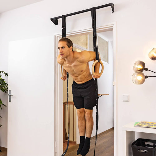 Consiga sus objetivos de fitness con esta robusta barra de dominadas que ocupa poco espacio y se monta encima de la puerta. Diseñada para ofrecer la máxima estabilidad y un confort óptimo, esta barra es el complemento perfecto para su gimnasio doméstico. Es ideal para montar encima de puertas, pasillos o vigas y permite realizar una gran variedad de ejercicios, desde dominadas, flexiones de mentón y elevaciones de piernas hasta movimientos desafiantes como palancas frontales o sentadillas en L. En combinación con las anillas de gimnasia, también puede realizar ejercicios de remo.