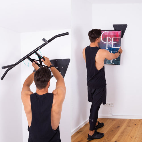 El exclusivo diseño en ángulo permite alternar entre dominadas y fondos en cuestión de segundos . La barra puede retirarse de la pared y guardarse después del entrenamiento. El adaptador de pared puede cubrirse con un cuadro, por ejemplo, cuando no se utiliza.
