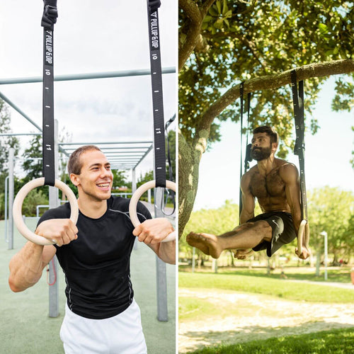Las anillas y bandas de gimnasia no sólo entrenan los músculos, sino que también ponen a prueba la coordinación, el equilibrio y la tensión corporal. Desarrollas fuerza funcional, no solo masa.
