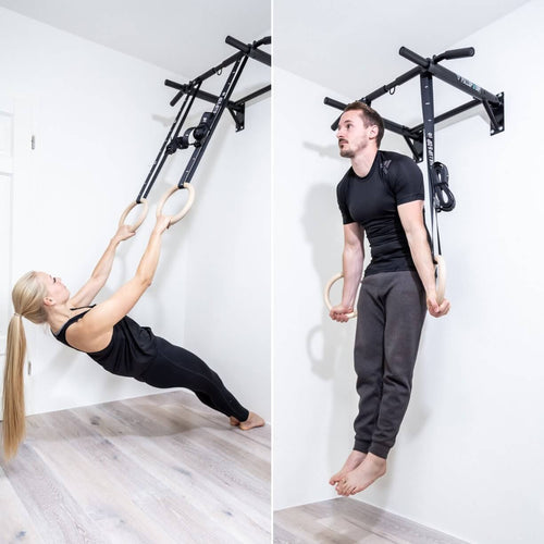 Extremadamente versátil como barra de dominadas, para entrenamiento abdominal o como accesorio para anillas de gimnasia para saltos con anillas o remo. Entrena todos los músculos de brazos, hombros, abdominales y espalda.