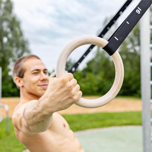 Entrenamiento con anillas gimnasia (en madera), proporciona un entrenamiento holístico y funcional para el entrenamiento con peso corporal, debido a que los músculos tienen que equilibrar la inestabilidad en todas las direcciones, producido por la libertad de movimientos con las anillas de gimnasia. Esto te dará un efecto de entrenamiento adicional en comparación con al entrenamiento con pesas o ejercicios guiados en máquinas.