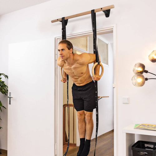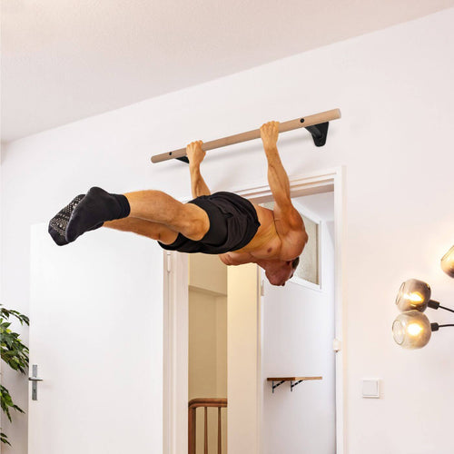 La barra de dominadas de madera se monta encima del marco de la puerta, en pasillos o en vigas estables para ahorrar espacio. Permite realizar una gran variedad de ejercicios: dominadas clásicas, dominadas de barbilla, elevaciones de piernas y movimientos desafiantes como las palancas frontales o las sentadillas en L. En combinación con las anillas de gimnasia o los entrenadores de sling, puede hacer que su entrenamiento sea aún más variado.